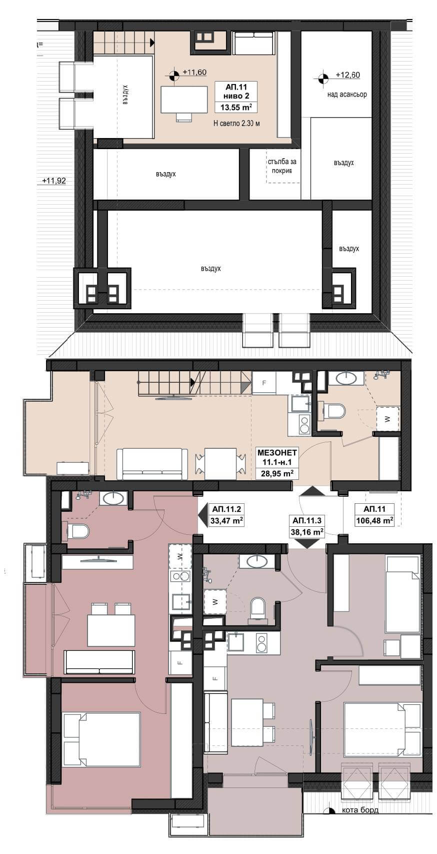 Мезонет – 3 Дневни с кухненски бокс, три спални, 3 бани с тоалетна, коридор, 3 тераси, кабинет, изба 2кв.м